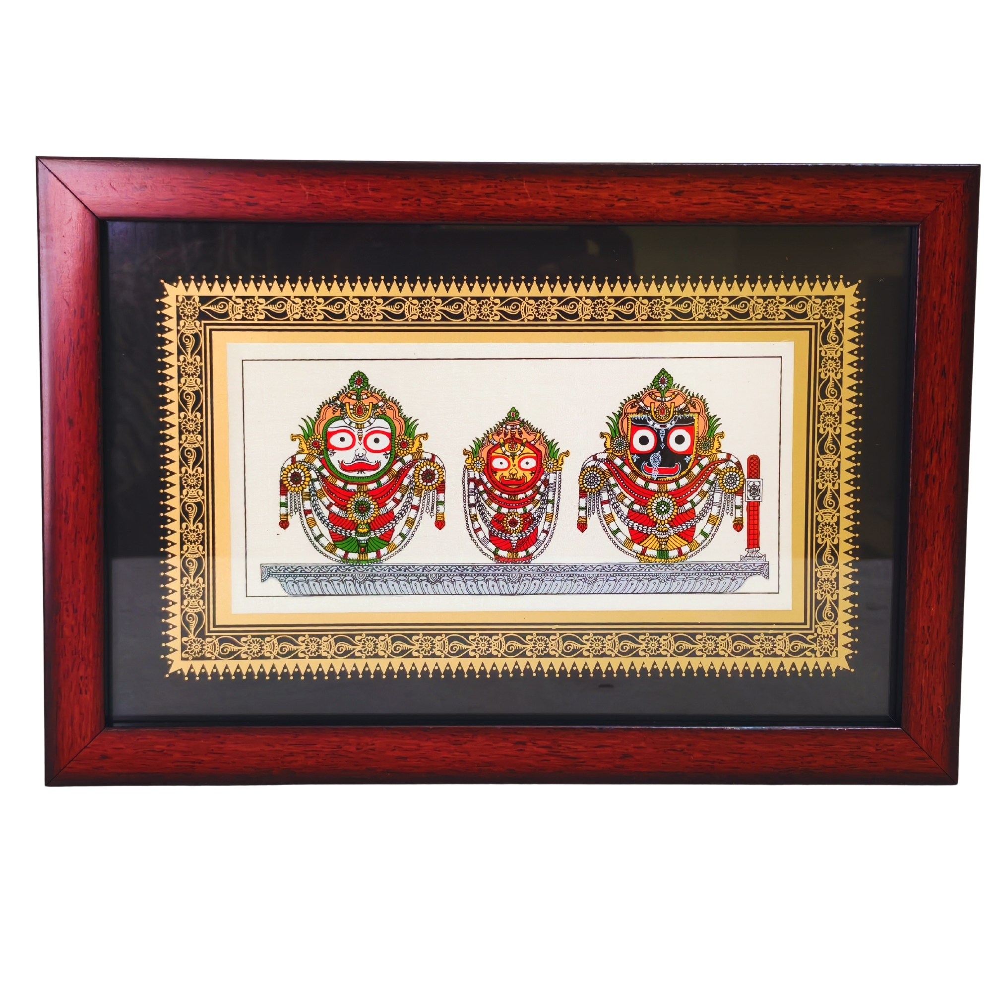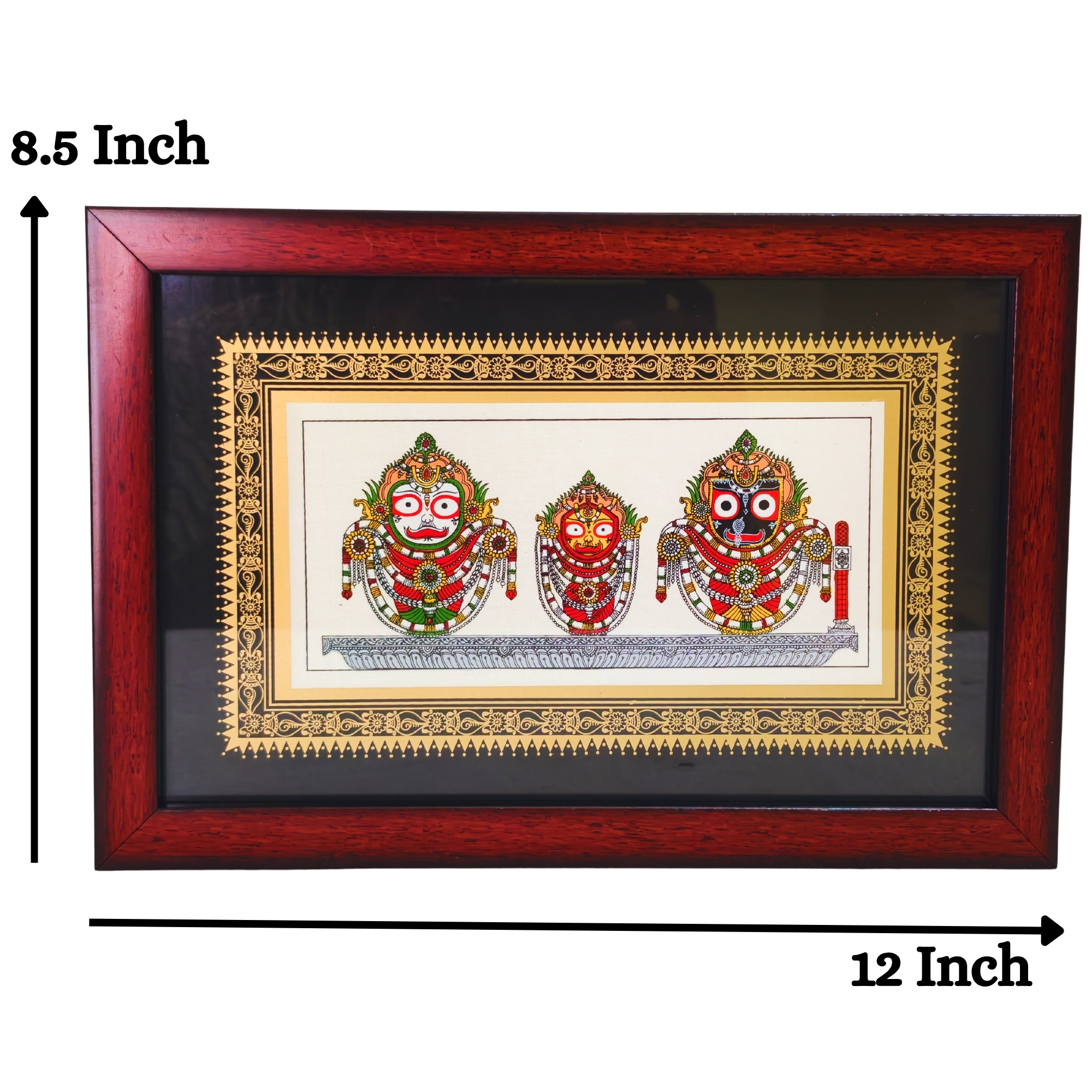 • 12 x 8.5 Inch wall painting featuring Jagannath, Balabhadra, and Subhadra