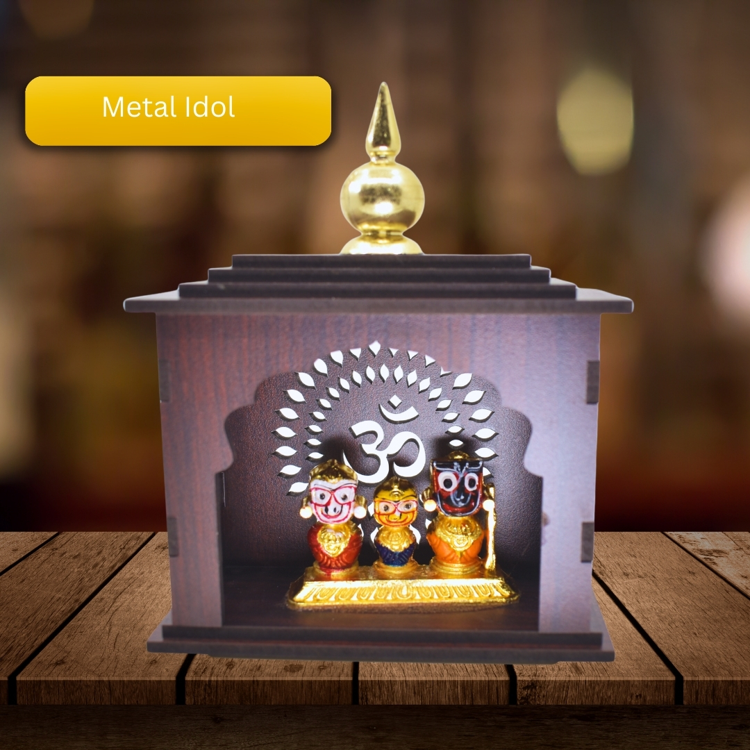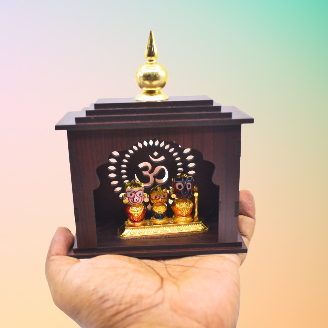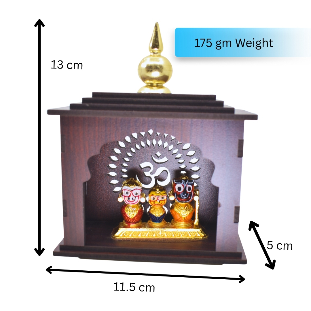 This Lord Jagannath metal idol in a small wooden temple brings the divine essence of Jagannath Puri into your home. Measuring 13 cm in height and weighing 175 gm, the idol is compact yet beautifully detailed. The temple structure is made of wood, housing the metal murti crafted with traditional design.