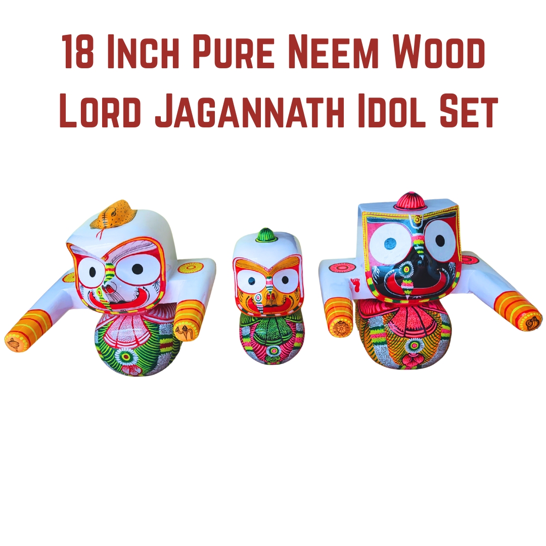 This Shree Jagannath Idol Set (18 Inch) is handcrafted from pure sacred Neem wood, a material traditionally associated with the worship of Lord Jagannath. The set includes Lord Jagannath, Balabhadra, and Subhadra, representing the divine trio worshipped in Puri.