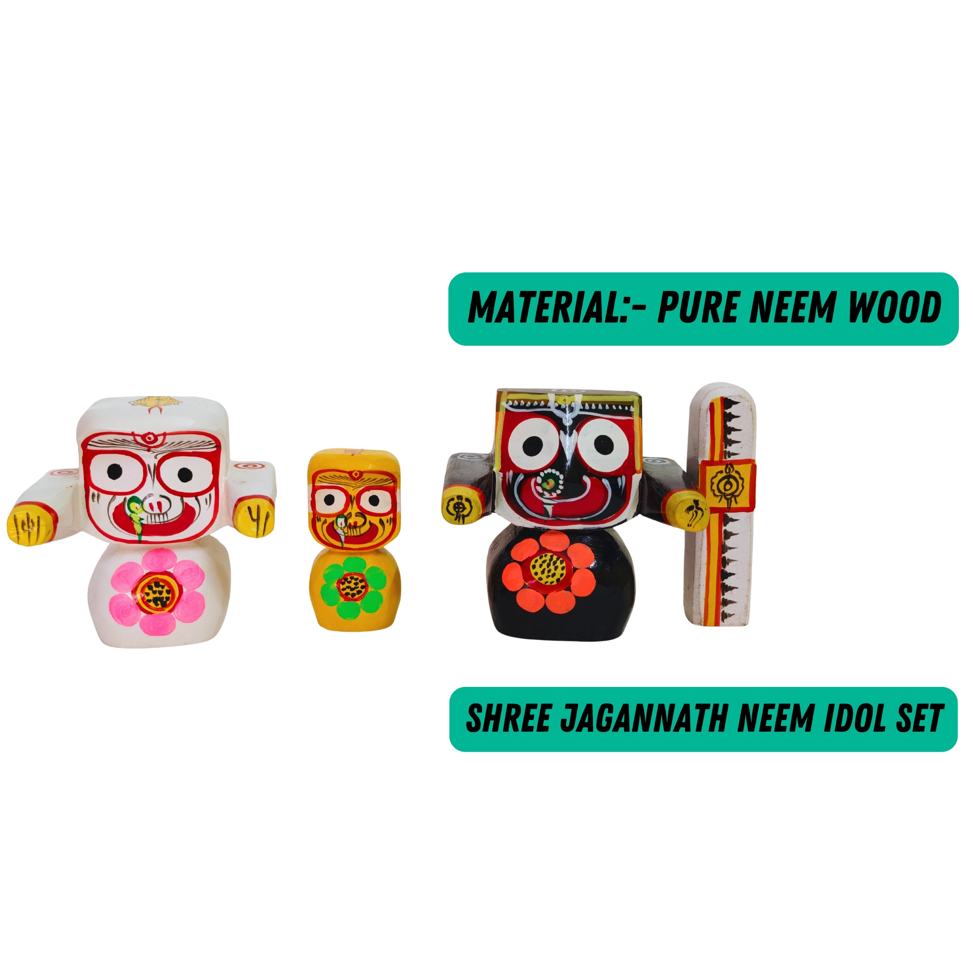 6 Inch Neem Wood Idol of Jagannath, Balaram, Subhadra, Sudarshan Set- (Pack of 4,Multicolor)