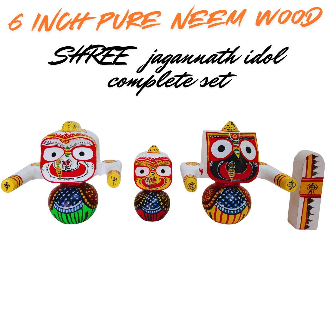 This Shree Jagannath Idol Set (6 Inch) is handcrafted from pure sacred Neem wood, which holds special importance in the worship of Lord Jagannath. The set includes Lord Jagannath, Balabhadra, and Subhadra, the divine trio worshipped in Puri.