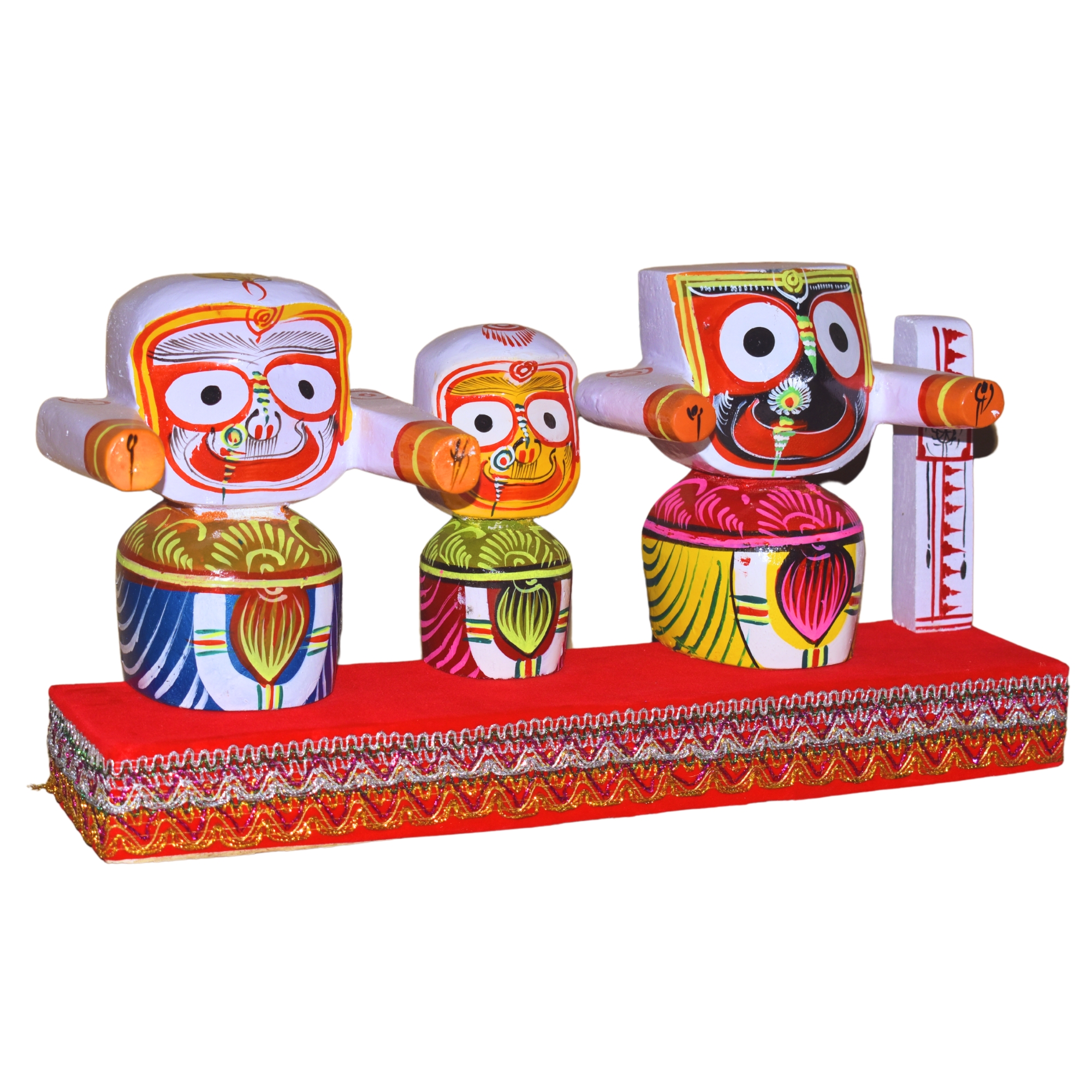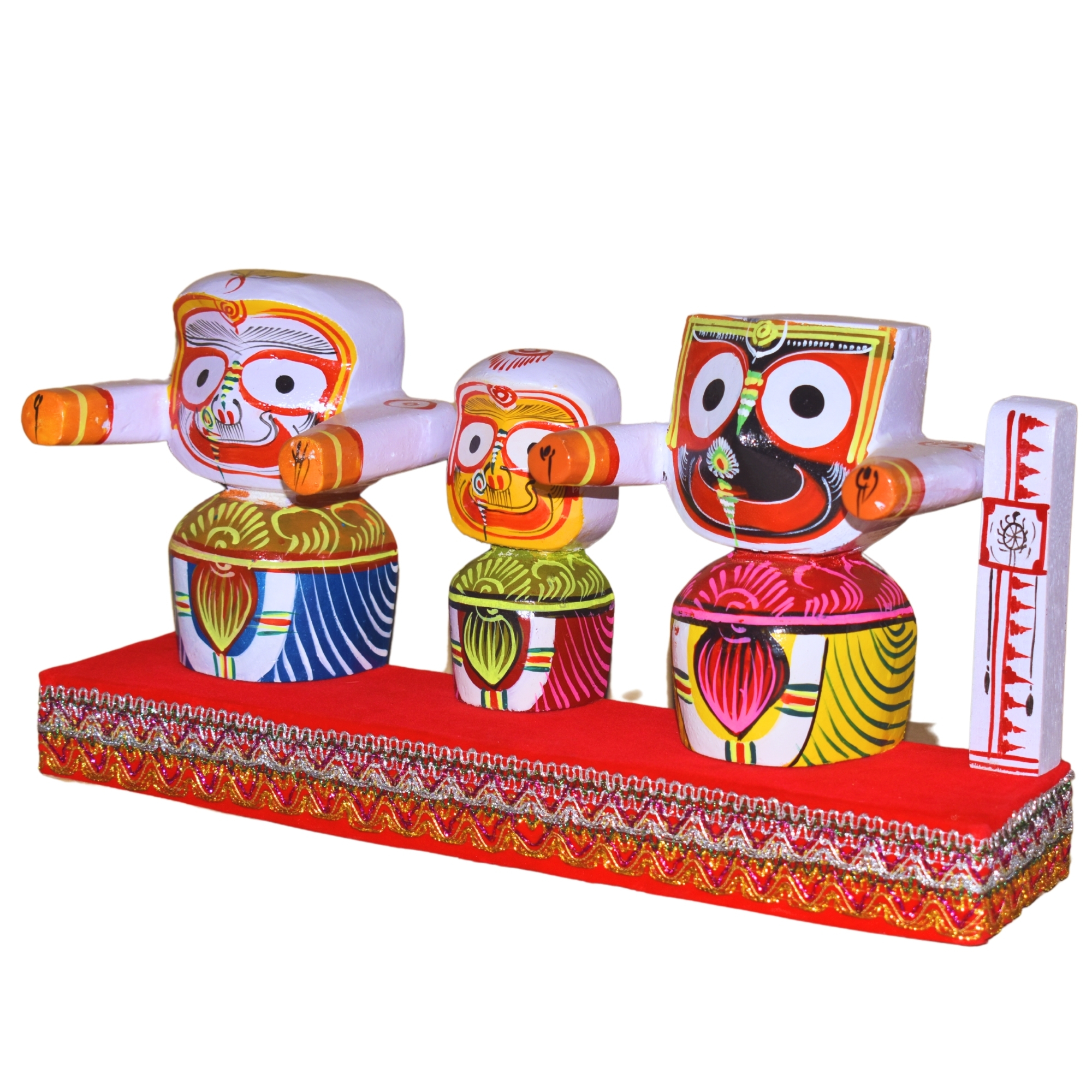 Beautiful handicraft colorful wooden idol of kaliyuga Avataar lord Jagannath Lord Bishnu bhalabhadra avatar of balaram and devi subhadra for home temple , living room, study room, hotels, office , corporate house , religious places,, festive gifts.car dash board , gifting etc, In Unbreakable, Just Best for Your Home Temple.