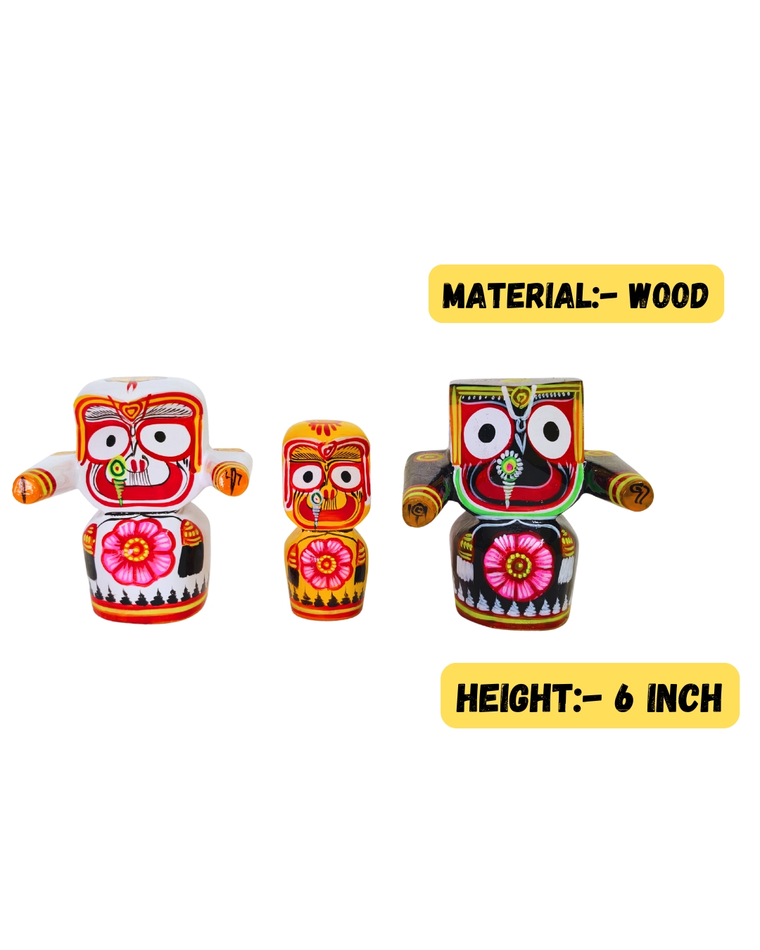 Made from quality wood, the set showcases fine craftsmanship with a simple and devotional appearance. The design captures the essence of Lord Jagannath, along with Balabhadra and Subhadra, making it a meaningful addition to any prayer space.