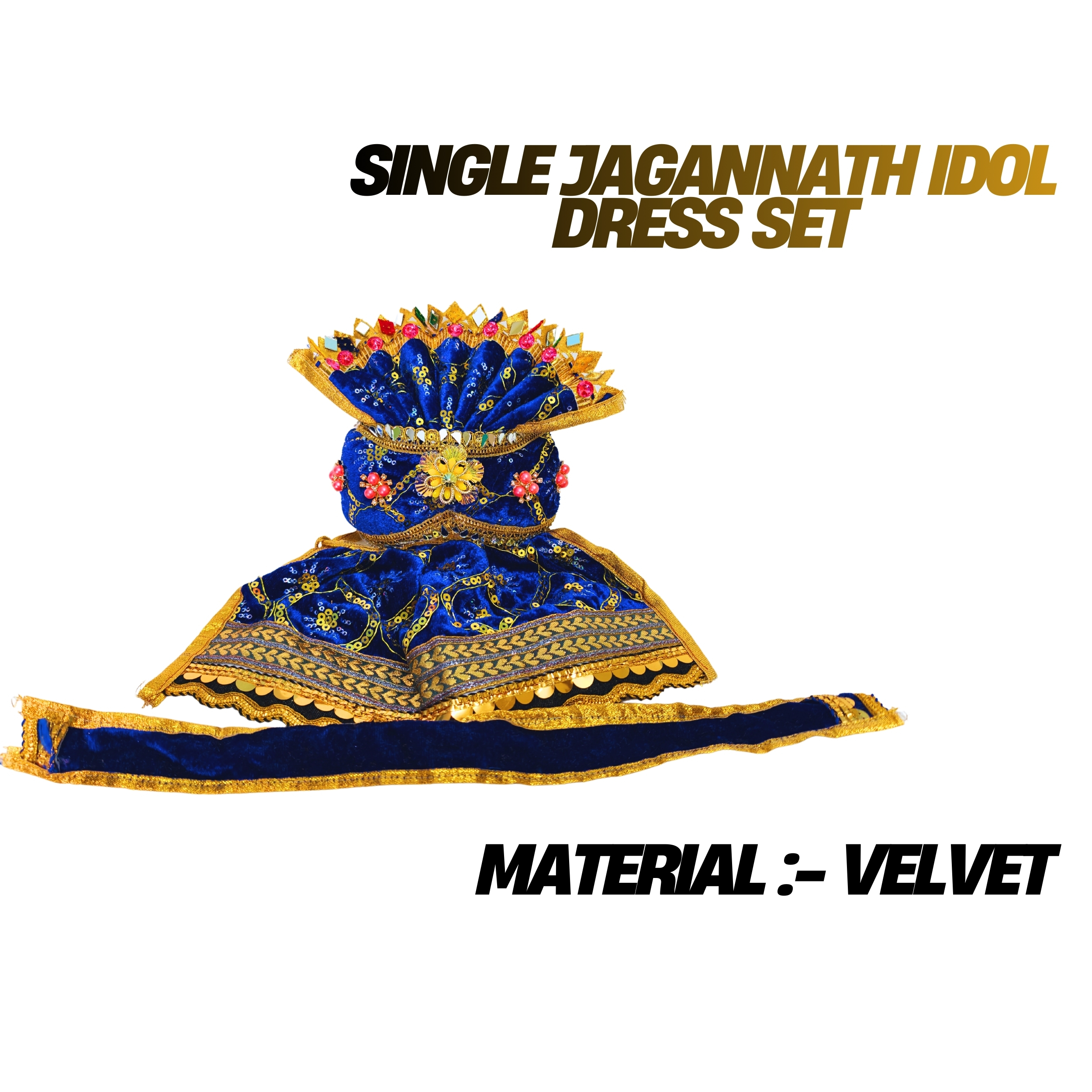 Made from soft, high-quality velvet fabric, the dress offers a rich texture and vibrant look suitable for daily puja as well as special occasions like Rath Yatra, Snana Purnima, and festive celebrations. The set typically includes pagadi (turban), mukut (crown), and matching vastra, carefully stitched to fit the idol comfortably.