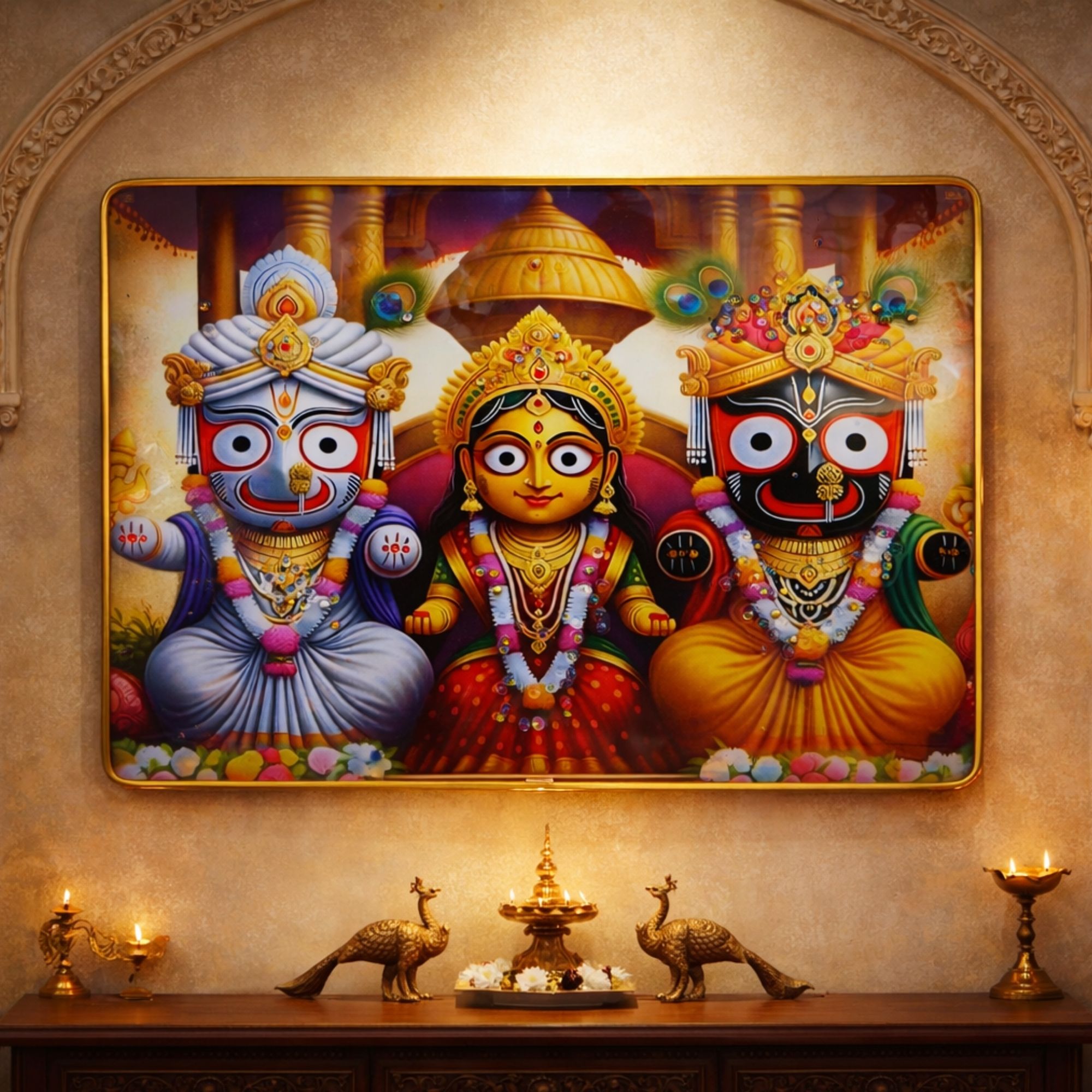 Elevate your home or office décor with the Jagannath World Crystal Lord Jagannath Wall Art. Crafted with a high-gloss crystal surface and encased in a golden slim frame, this (30x22cm) masterpiece radiates elegance and spiritual charm. The divine image of Lord Jagannath brings serenity, positivity, and cultural richness to any space—whether it’s your living room, bedroom, or workplace. Designed for durability and timeless appeal, this wall art is not just decoration, but a statement of devotion and style.