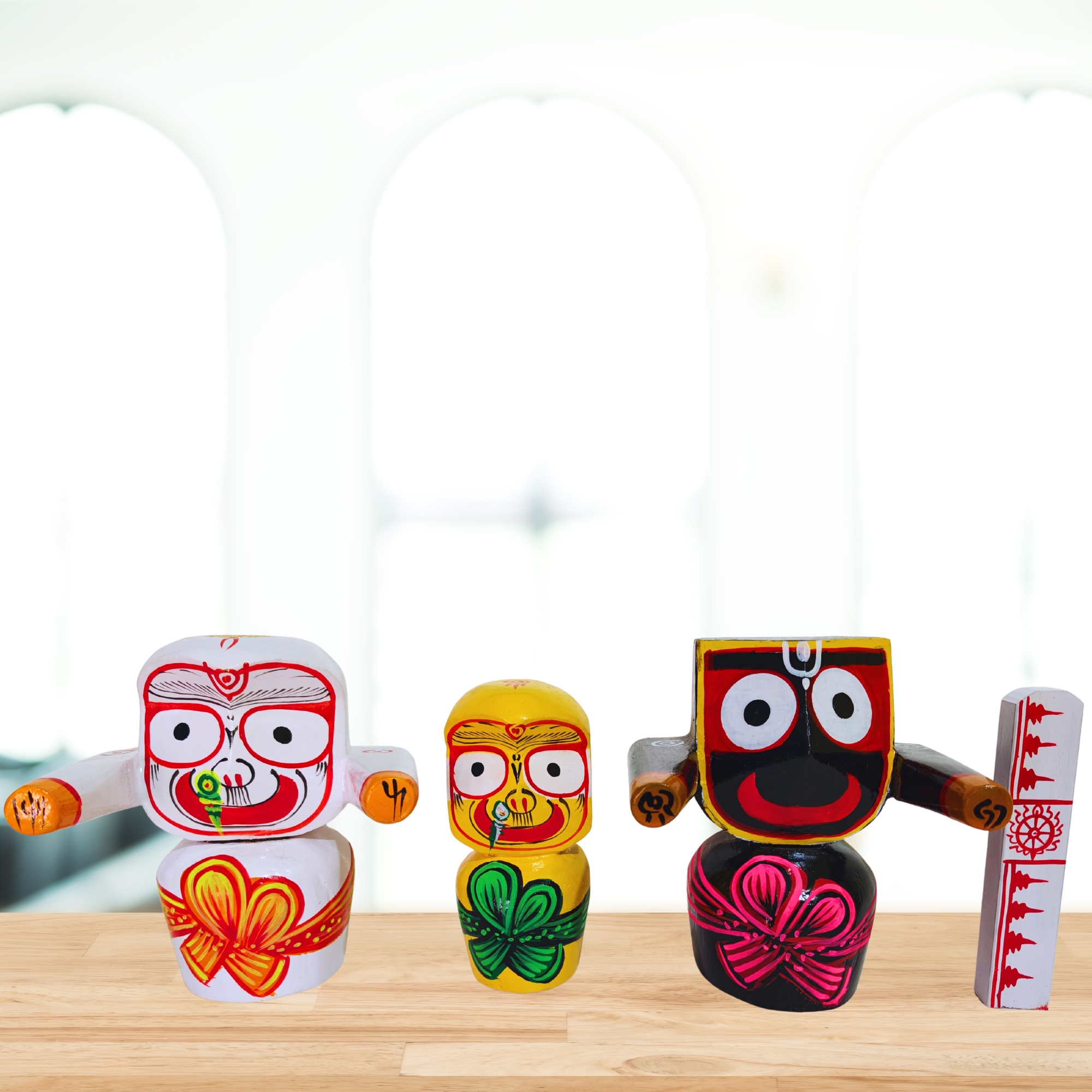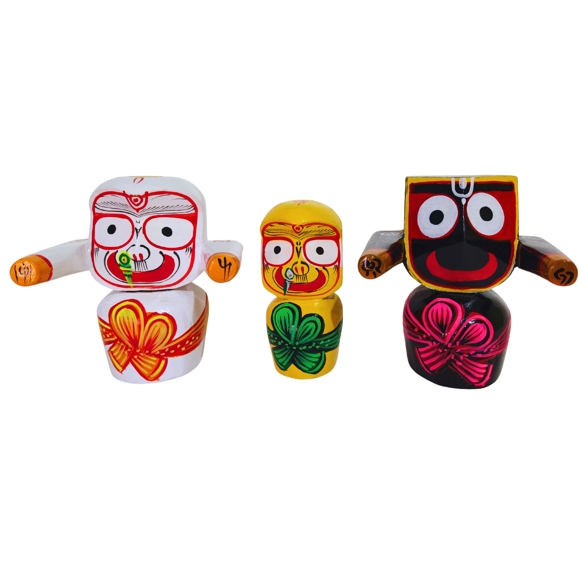 Beautiful handicraft colorful wood carved wooden idol of lord Jagannath balaram and subhadra Lord Krishna Abatar for living room, study room, hotels, office , corporate house , religious places, home temples, festive gifts.car dash board , gifting etc, In Unbreakable, Just Best for Your Home Temple or Dashboard Of Car. The brand comes with 2 decades of experience flourishing a comprehensive collection of handicraft items. carefully designed and crafted. Each product is a marvel and can be said to be a novelty and with no doubts their features and characteristics make them a worthy addition to your home decor collection