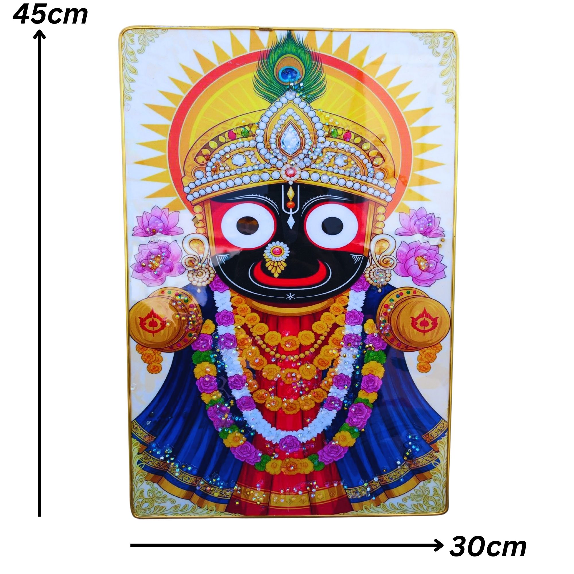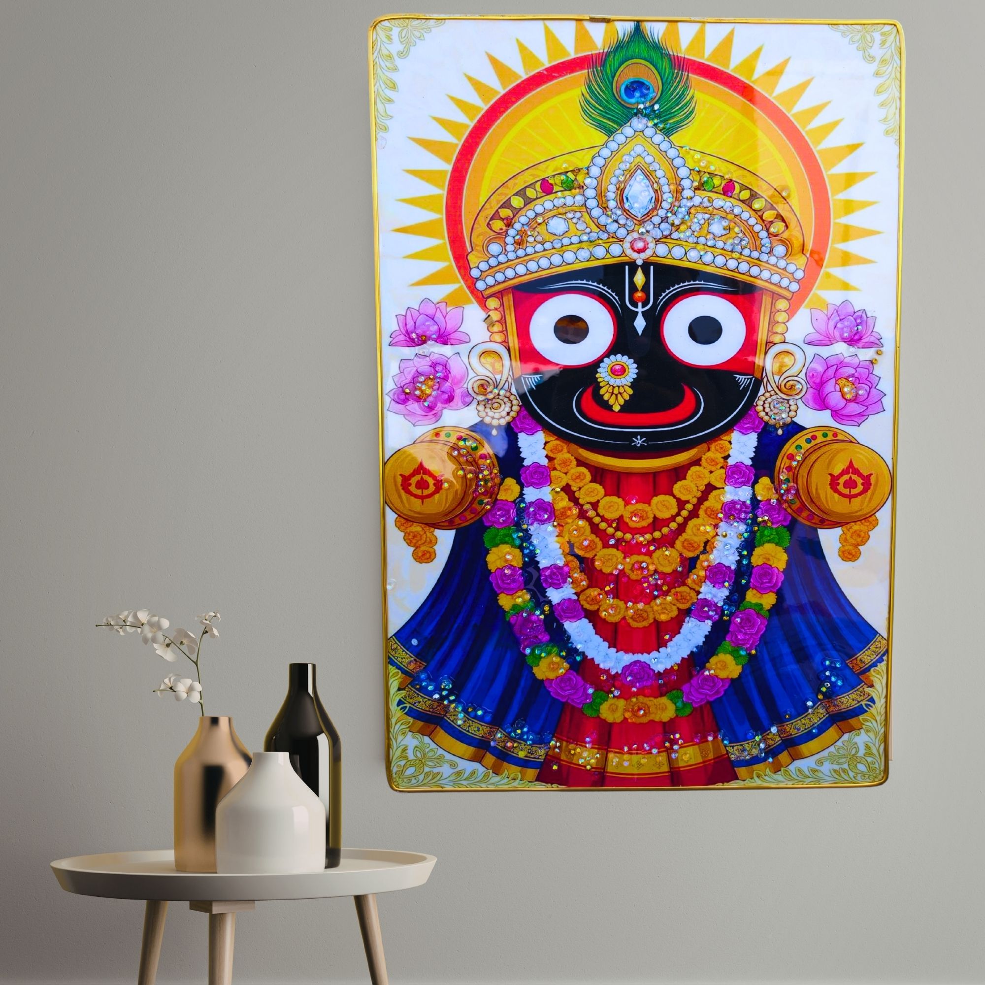 Lord Jagannath Crystal Wall Hanging with High Gloss Surface & Golden Slim Frame – Home Decor 45 x 30 cm
