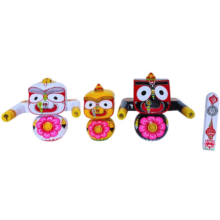4 Inch Handcrafted Pure Neem Wood Jagannath Idols Set – with Elegant Pagadi Dress
