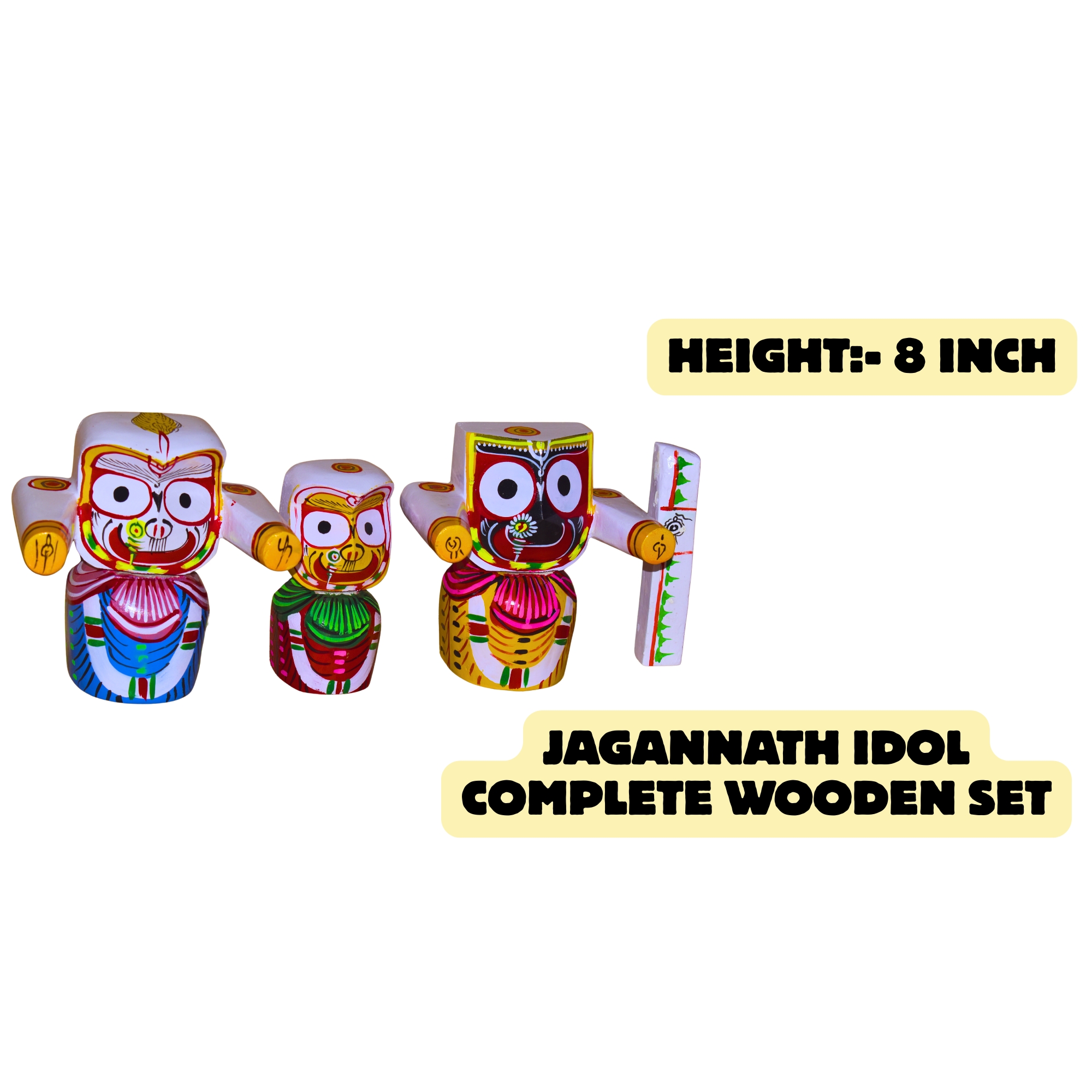 8 Inch Wooden Lord Jagannath, Balabhadra, Subhadra Idol Collection Set with Sudarshan(Pack of 4, Multicolor)